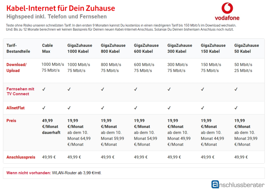 Das Vodafone Hybrid-Fiber-Coax Netz ist ein leistungsstarkes Hybridnetz aus Glasfaser und Koaxialkabeln ("Kabel-Glasfaser") für sehr große Bandbreiten von derzeit bis zu 1000 Mbit/s. Zukunftsfähig ausgelegte Multimedia-Infrastruktur – Internet, Telefon, Fernsehen und Radio aus einem Anschluss – einfach und schnell. HD Fernsehen ohne das die verfügbare Bandbreite beansprucht wird. Direkt nutzbar über das vorhandene TV-Kabel.
